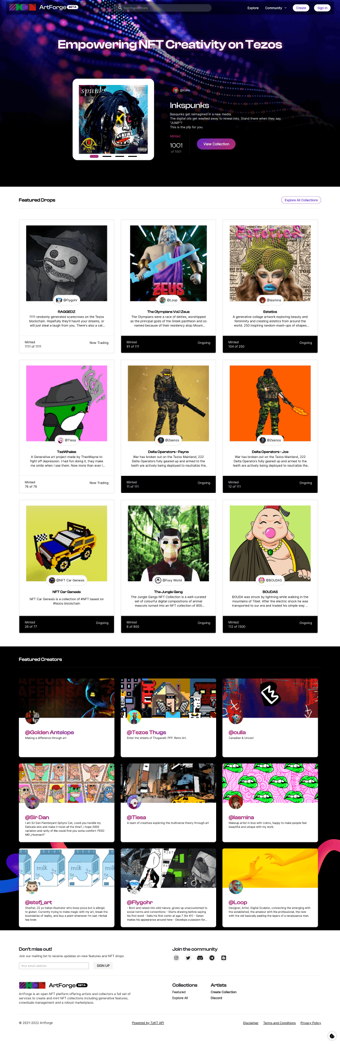 We created an NFT collection factory smart contract which provides artists with the abiity to easily customize the NFT collectios and sell them on ArtForge. Collections minted on ArtForge are automatically listed on objkt.com.